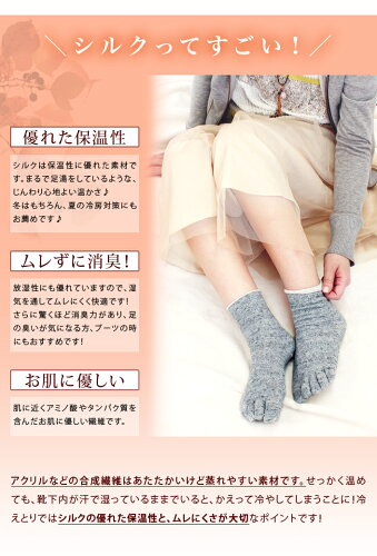 通常 1,684円のところ セットで 1,598円 さらに タイムバーゲン 1,500円 送料無料! >カバーソックス単品950円はこちら >インナーソックス単品734円はこちら ■生産地:日本 ■サイズ:女性用22〜24.5cm ■素材: 内絹外綿 5本指インナーソックス、 内絹外綿 先丸カバーソックスともに 肌に当たる内側はシルク100%、外側は綿100%です。